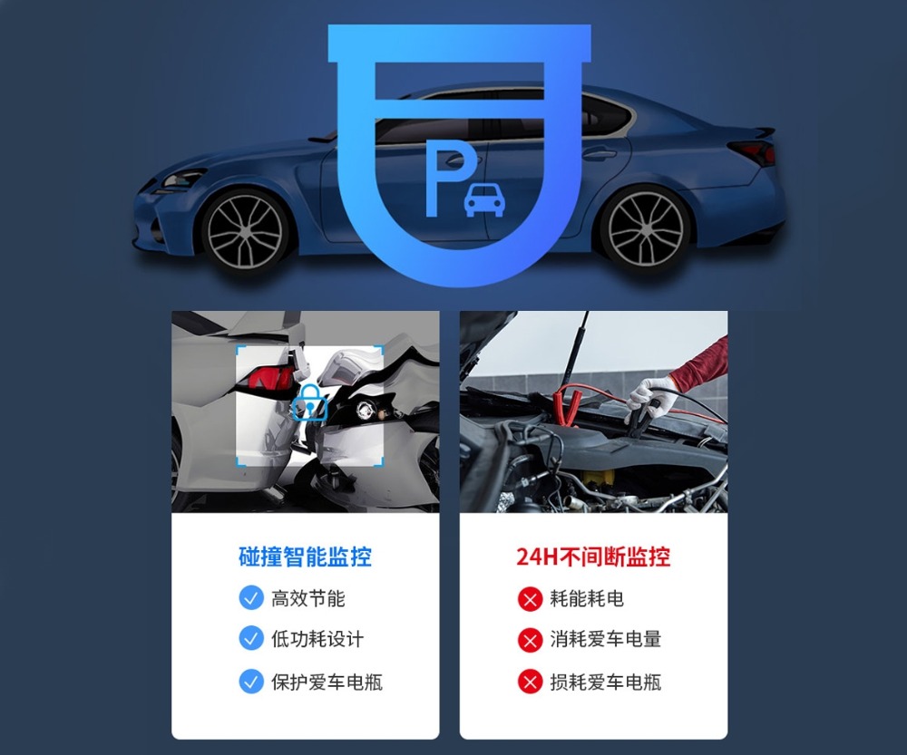 支持智能停车监控功能,采用检测碰撞开启监控的方式。在汽车熄火后,如果遭受异常震动,会自动唤醒录制当下视频,保留证据,录制完成后则自动关闭监控功能,相比24H不间断监控的其他品牌记录仪,本产品更加高效节能、在很大程度上保护了爱车电瓶!